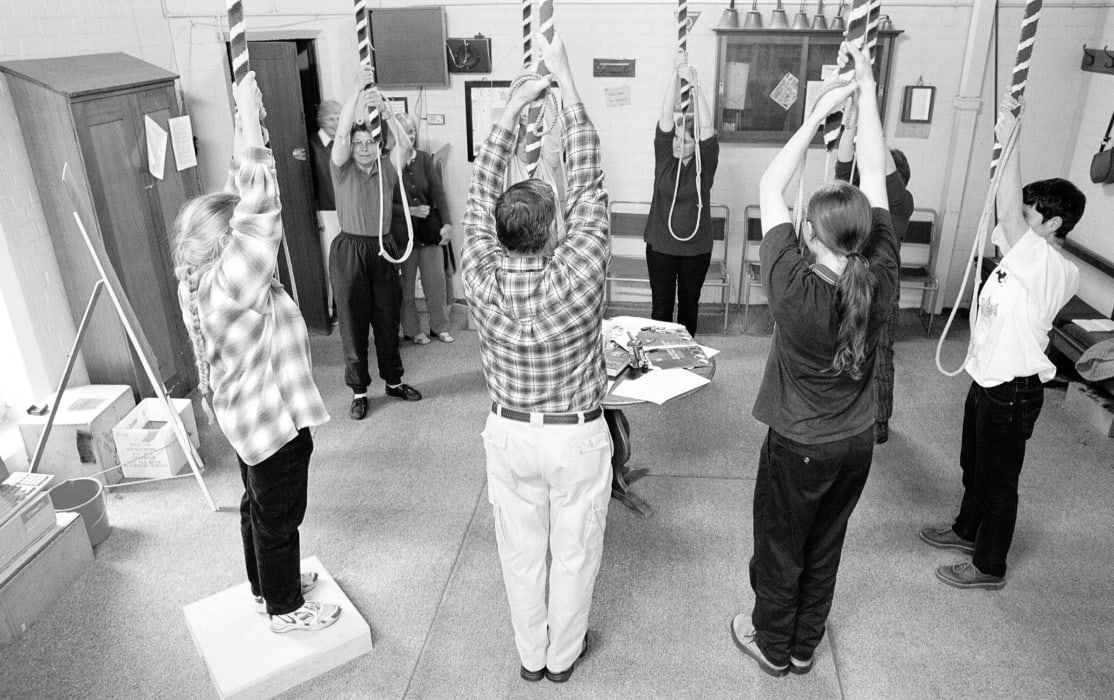 Bellringers at St David’s in 2002, bellringers clockwise from left Dru Heywood, Audrey Cusick, Kate Webb (obscured), Sheila Harrington, Hazel Hilman (obscured), Jane Keble-Williams, Josh Webb and Gary Hilman. Standing by the door are Ruth Brammell and Hilary Fawcett. Hilary, Ruth and Kate are still with the band. Photographer Doug...