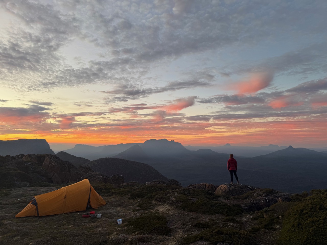 On our last night, we pitch our tent on the summit of Falling Mountain. I walk to the edge and look out at the Du Cane Range — all sheer cliffs, huge boulders and green skirts. I watch the light creep down the range, painting peak after peak in gold, the mist settling into the valleys, and the sky, with clouds infused with wildfire smoke, erupting into flames. I am giddy. It is almost too much. For out here, we are rich in time, and wonder, and some sort of hard-won grace. And there is peace in this simple existence of walking with just your means of survival on your back. Your pack is heavy, but it is lighter than all the things you carry in your life at home.