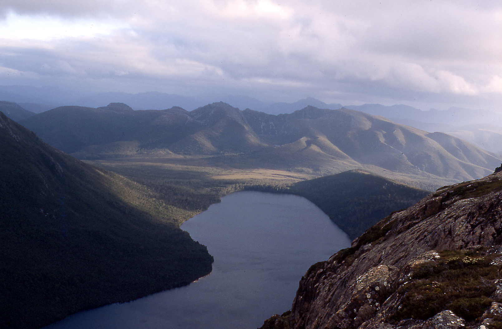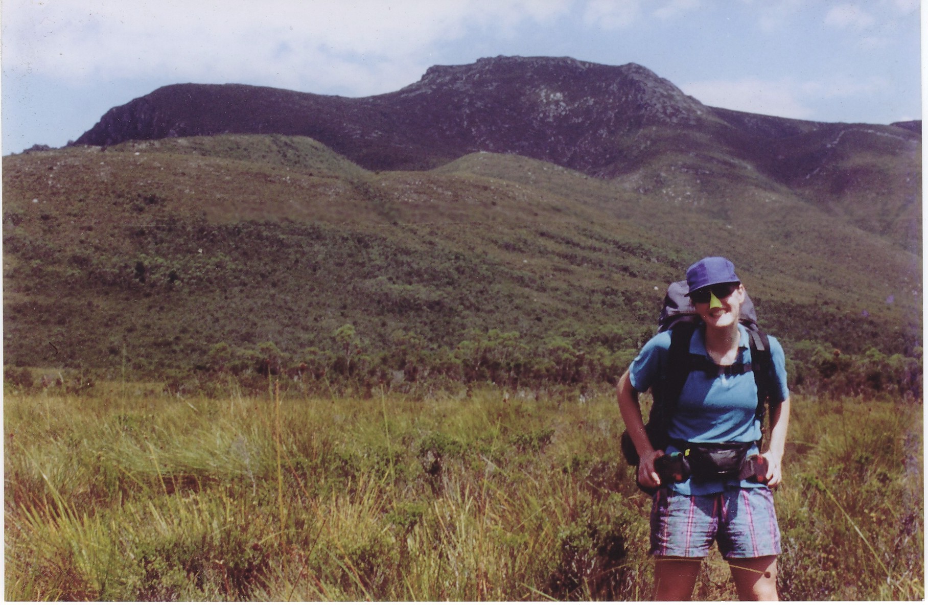 After my catharsis, I erected the tent and then crutched with renewed energy the short distance to the top of the moraine, the one that had troubled me so on the outward journey. From the main track, I followed a short side track up the spine of the ridge. As the sun sank, I sat at a high point and contemplated the expansive view. I saw Jane, complete with sun protection for her nose, returning from the car, crossing the button grass, Schnells Ridge in the background.