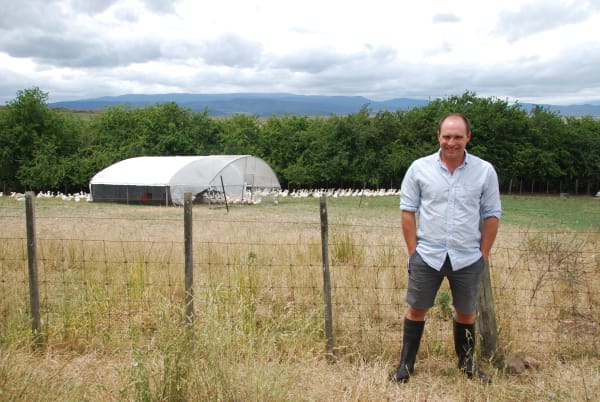 As we stroll across small paddocks between old sheds, ducks quack amiably and scoot about. A hosepipe with fogger attachment creates a cooling mist for them in the summer sun. Those under five weeks are housed in shelters made of aluminium, and shade cloth and “twenty bucks worth of screws”. Here they are protected from crows, and the shelters, mounted on sleds, are towed to fresh pasture every few days.