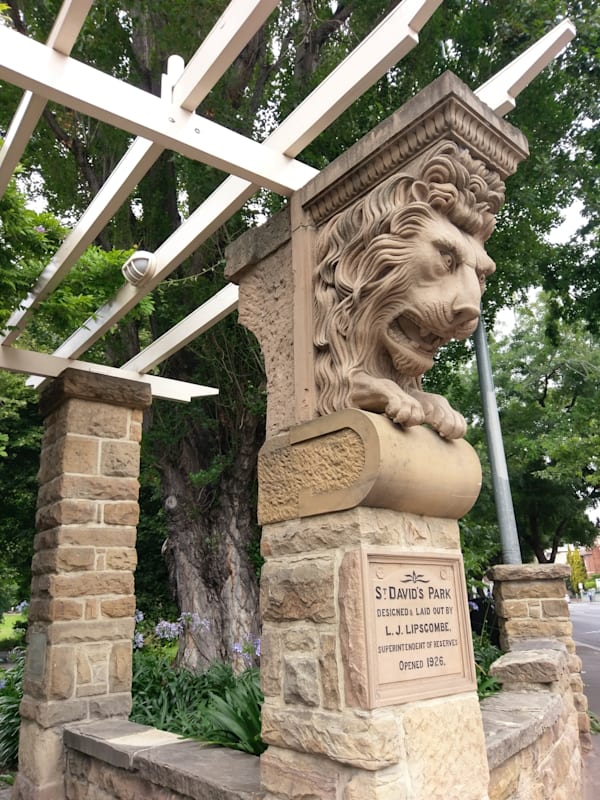 Yet care was taken to allow two stone survivors to escape this destructive progress. A pair of ornamental lions once guarded the main entrance to the apparently pretty bank, and they now adorn the entranceway to St David’s Park. Being a former cemetery, the small pride now presumably guards a different kind of vault, although they clearly did a poor job of protecting their building.