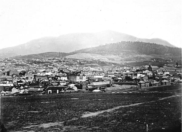 It is identifiable by its location, three slithers of an end window, and its church-like shape and dimensions. Because so many early photographers delighted in snapping the city cowering beneath Mount Wellington, the cityscape was repeatedly captured in film in the 19th century from much the same viewpoint. This photographical canon makes analysing the shifting architectural history of this city uniquely easy. Certain buildings help date photographs, and photographs in turn help date buildings.
