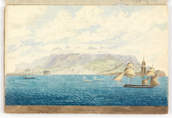 Hellyer shows the Cape Packet in the foreground. The two little rowing boats in the centre have raised curved prows of the local “fashion”