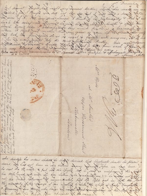 This is the “envelope” which was simply a page of paper wrapped around the other folded pages then sealed. Postage was expensive, so no paper was wasted and the letter was written ‘crossed’ with lines running horizonal and verticle – even on the envelope’s concealed flaps