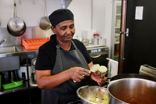In late 2019, Abebea began a work placement at the Kitchen to practice her English and gain work experience. She is now an employee. “Spicy, chilli, injera, anything Eritrean style, I cook it. I love to cook,” she says. On the cafe wall is a small poster about Abebea. It says she would like to open a small business cooking Eritrean food.