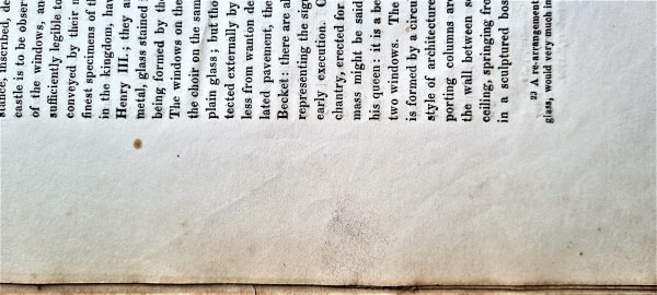 So, I’ve picked it up again and am wondering what to make of it. The first section on Amiens is the most badly torn, as indifferently treated as England’s own continental history tends to be. There are smudgy marks on the page edges that suggest someone read at least part of the story of Canterbury Cathedral. One smudge is a half-decent thumbprint, still identifying some long dead reader.
