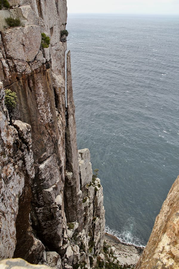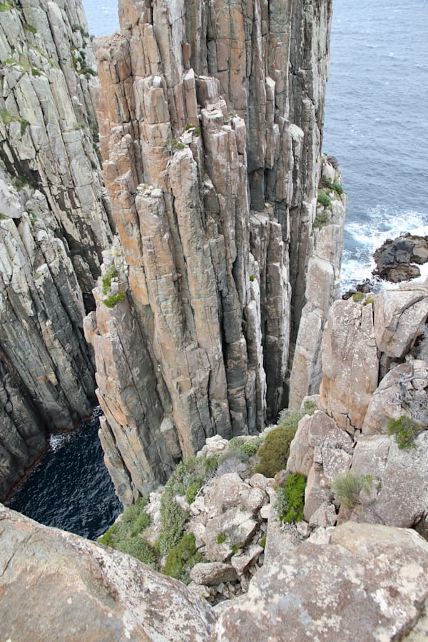 As I crawl gingerly onto the final bluff of Cape Hauy, the wind and wuthering continue, like an echo of that Gondwanan break-up. My eyes travel down the mottled grey columns, dizzyingly downward, until they reach the ocean. There waves are carrying on the argument, pounding and foaming restlessly at the base of the vertiginous cliffs.