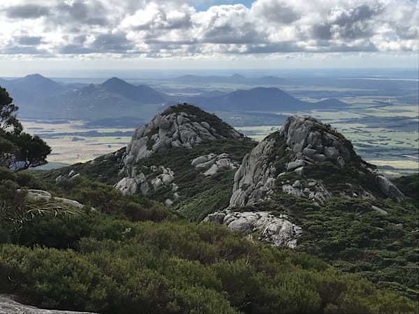 Climbing Strzelecki is a ritual part of visiting Flinders Island. It gives one an eagle’s eye view of much of the island, setting in context the mellow farmlands, the sleepy old roads crossing hill and dale and the dramatic ranges of the mountains. The climb gives one a 360-degree view of the island’s surrounding ocean waters, which are dotted and dashed with many smaller islands, each with a personality and history of their own. The mountain provides one with views of empty beaches, broad estuaries and bays, grazing cattle and sheep, and romantic empty dirt roads leading to lone houses on windy hillsides. Listen closely and you will hear the lazy sighing of currawongs in the trees or the honking of Cape Barren geese in the paddocks.