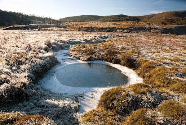 Water has an unusual property which allows ice to float on the surface rather than sink. Recently I walked on one of Sweden’s larger lakes, Torneträsk, at the top of the country within the Arctic Circle. Like this Tasmanian pond, the Swedish lake was iced over, although the thickness of the lake’s ice was considerably greater than on the little pond.
